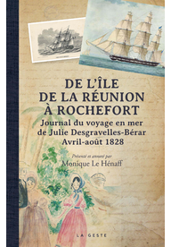 Julie Desgravelles-Bérar a tenu presque quotidiennement son journal durant son voyage en 1828 de l’île Bourbon (la Réunion) au Havre à bord du trois mâts La Pallas. Agée de 22 ans, elle quitte son île natale et accompagne, avec leur fils de 2 ans, son mari commis de la Marine, muté de l’île de la Réunion à Rochefort. Elle vivra à Rochefort et y mourra à 70 ans.